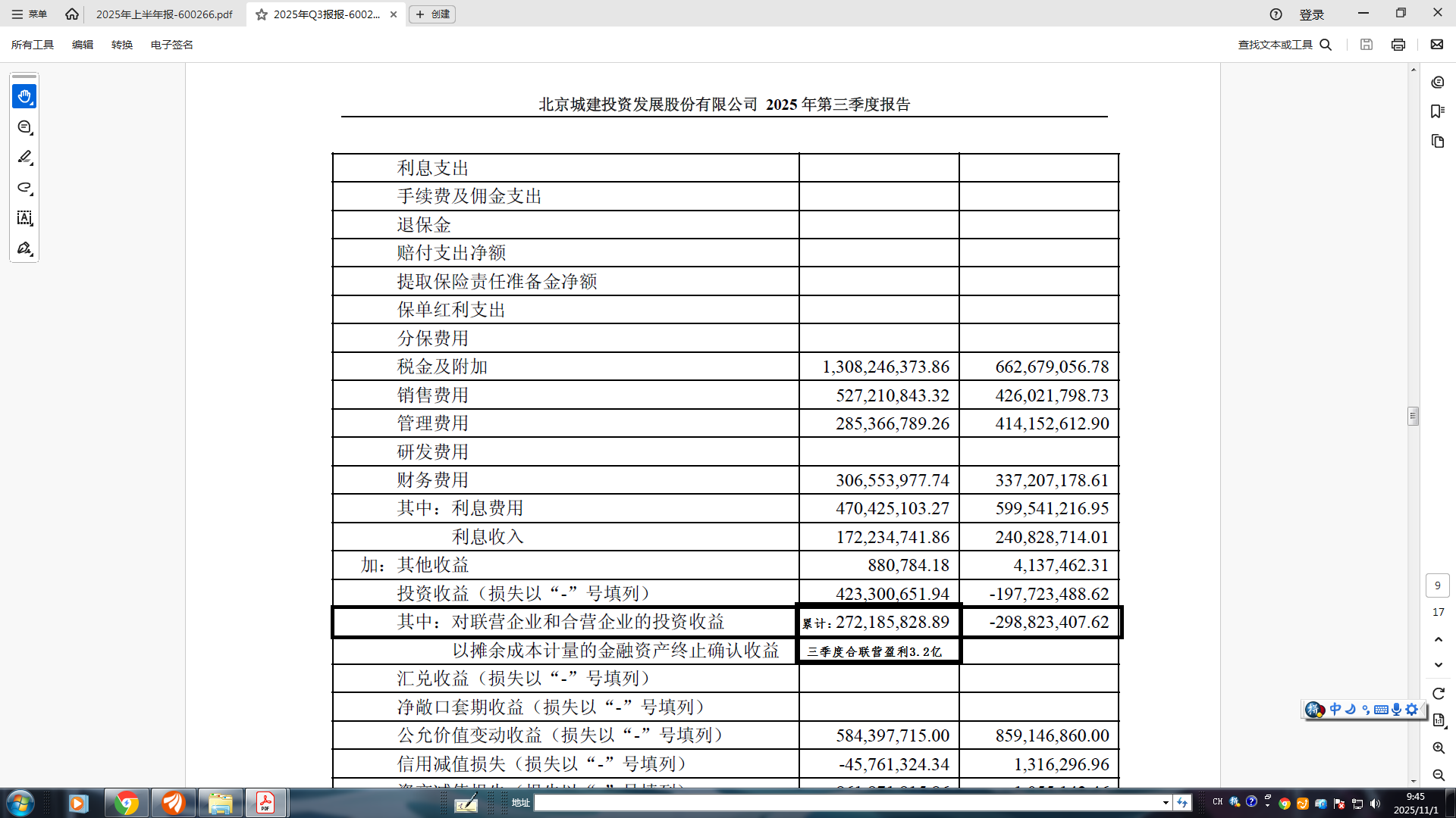 估计来自:文源府(建发50%)、国誉未来悦(阳光城51%)所分得的收益,上半年此项是亏500万元,三季度入账的营业收入60多亿产生的利润较低约1亿,权益额资产减值-6.6亿,扣非的净利润-2.5亿