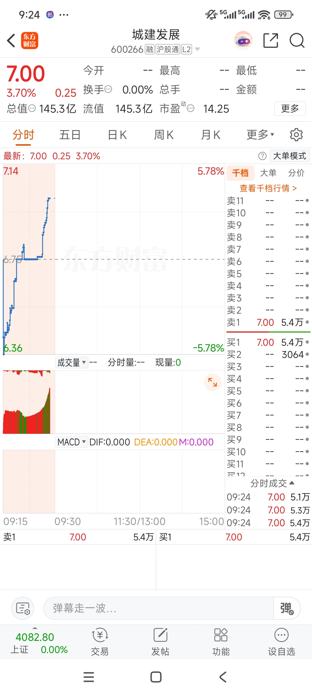 $城建发展(SH600266)$ 看这个集合竞价的走势,主力进来了,今天必涨停。跟我昨天预想的和分析的一样。