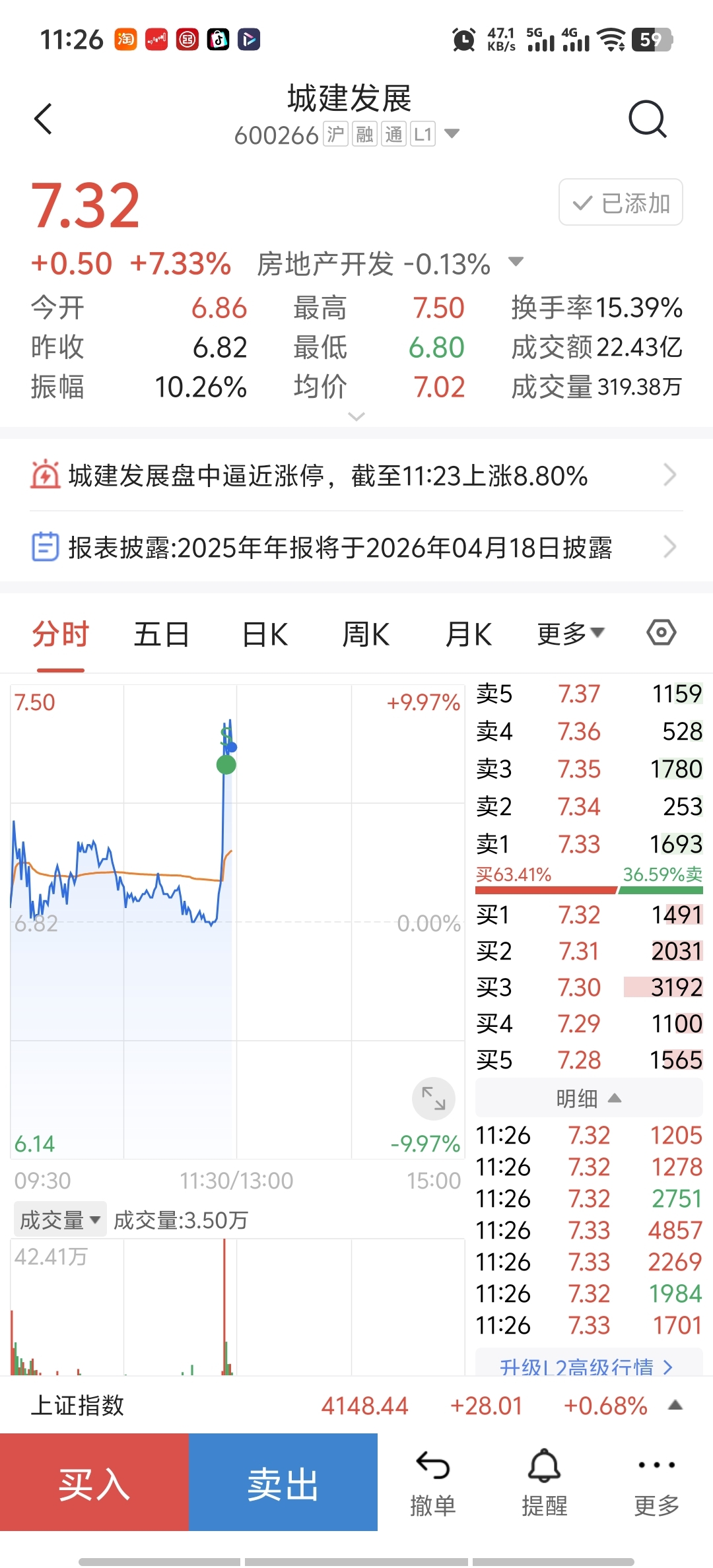 下午盘中再看机会,城建股份7.28出的,也没有出得很高
