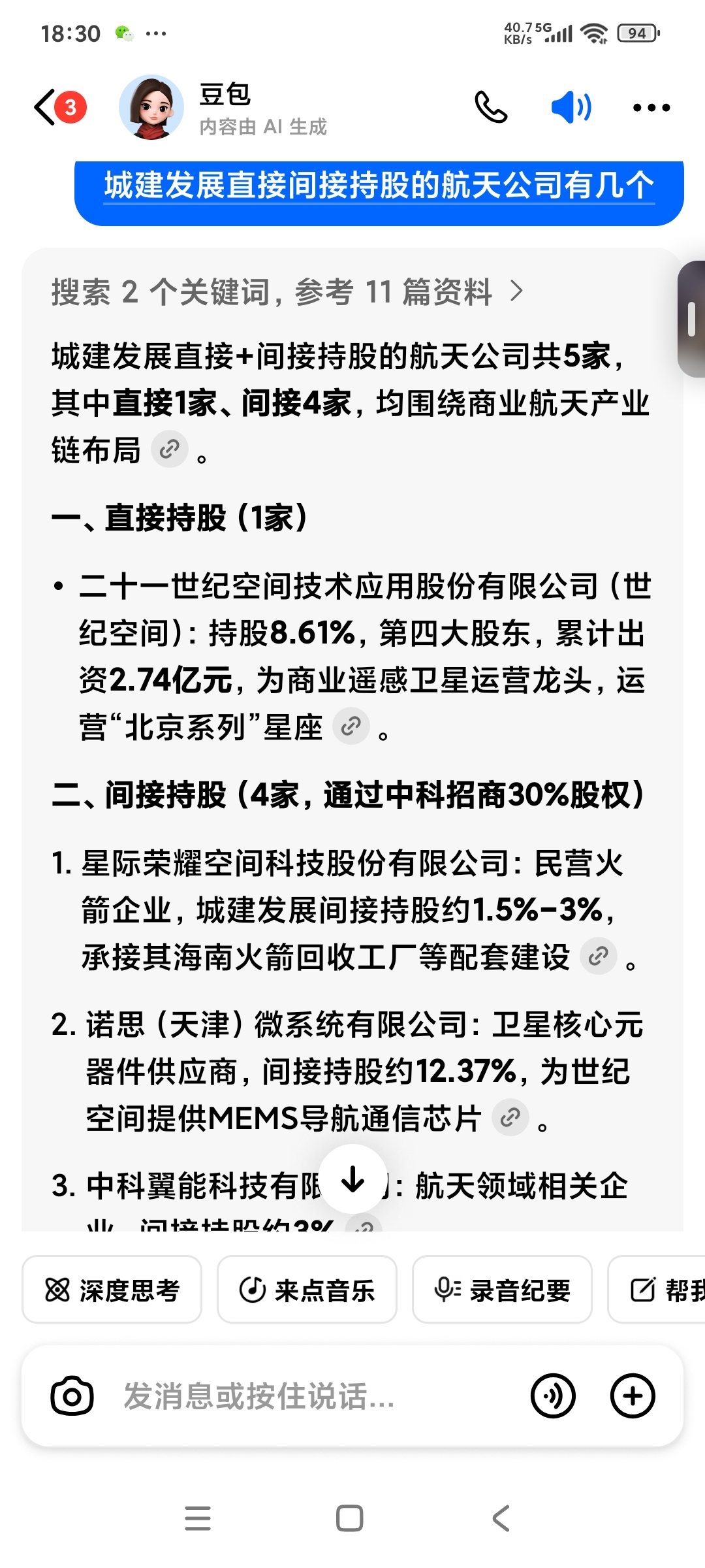 城建发展:尊敬的投资者您好,感谢您对公司的关注。公司持有二十一世纪空间技术应用股份有限公司1891万股,占其总股本的8.61%,是其第四股东,除此之外未投资过其他商业航天领域的项目。
