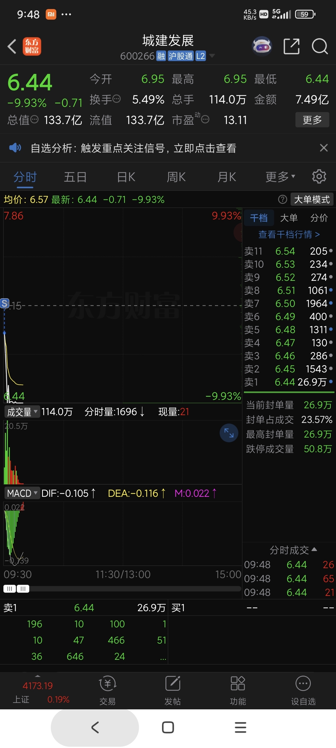 $城建发展(SH600266)$ 渣渣票,看着板块不对,直接竞价逃顶卖出……