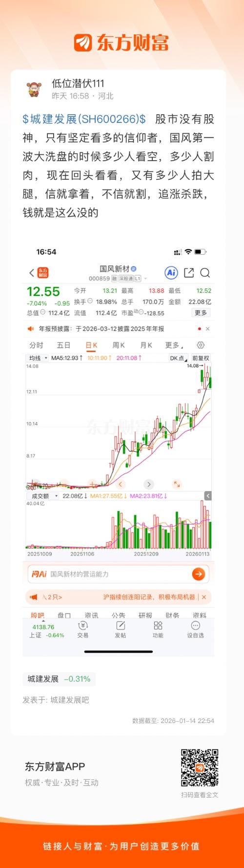 $城建发展(SH600266)$ 股市没有股神,只有坚定看多的信仰者,国风第一波大洗盘的时候多少人看空,多少人割肉,现在回头看看,又有多少人拍大腿,信就拿着,不信就割,追涨杀跌,钱就是这么没的