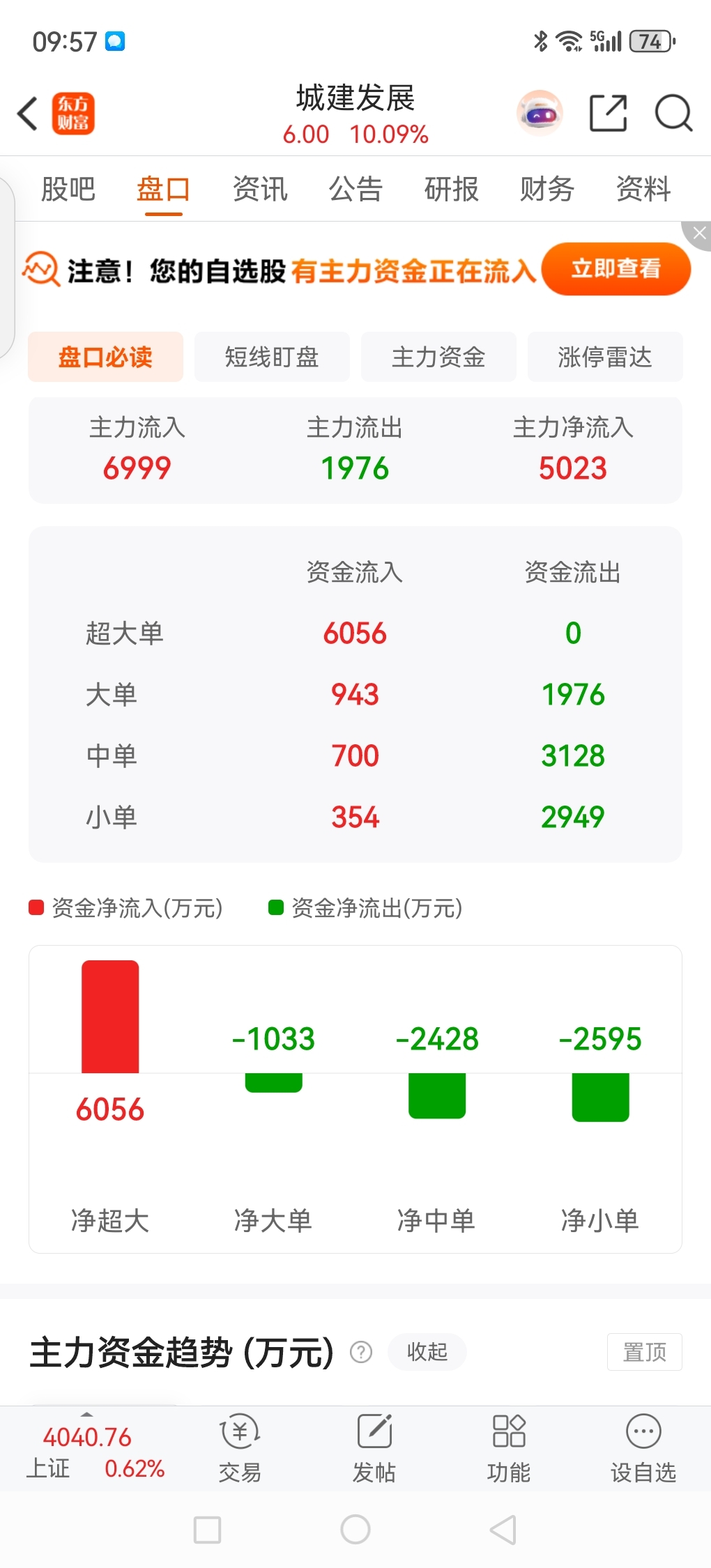 $城建发展(SH600266)$ 主力流入,傻散卖出
