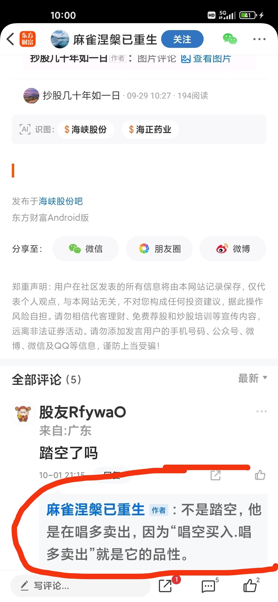 感谢“谈股麻雀大师”在长假中还关心偶如一日,并友情去海峡股份指导工作,辛苦了。你
