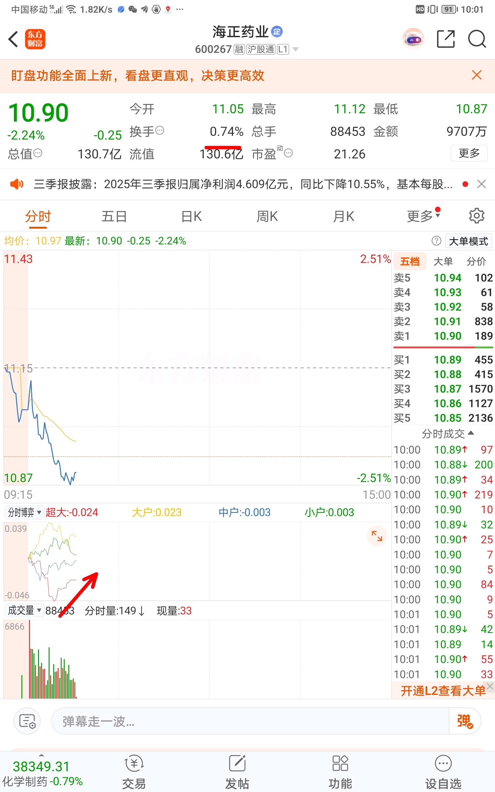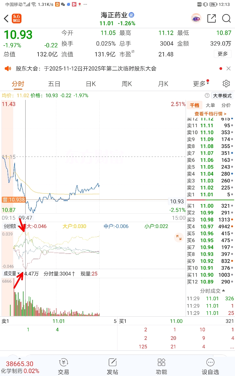 $海正药业(SH600267)$ 指向驴队伍在10.88元拼命的卖,明明下面10.87的买方在排长队并且超大单早已经洗盘结束掉头低吸了而他们就是在10.88抢着卖出才使当时开盘半小时换手率就达到0.74%,而后面他的队员中有小部分觉醒了惜售了才使后来换手率明显下降,说明指向头驴今天指挥不力,下午加油卖啊