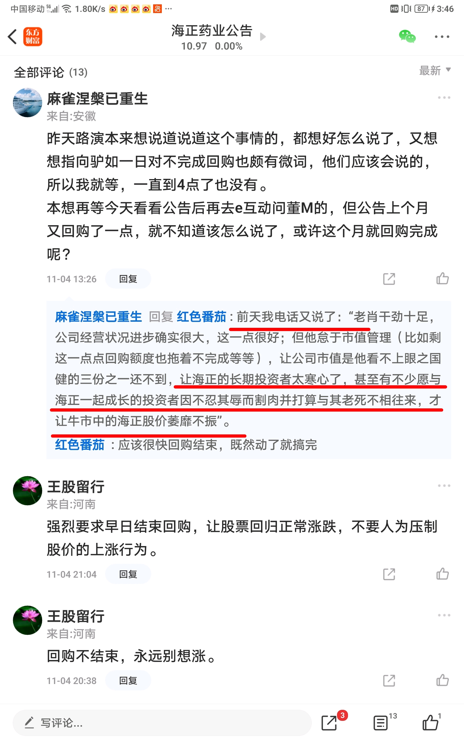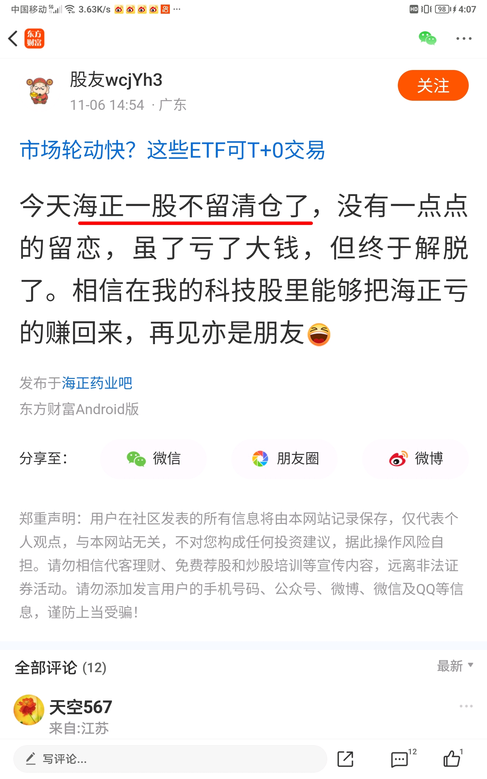 投资数千W六年一股没卖的大Vh3可能是前激羞了老肖才撵走了他,六年海为了在海吧留有发言权才留了底仓一百万,铁脑壳等是被指向九点如一日7月4日9元区间拖走了不再染指。因此海正的股价不但难能回归20元,而且还在11元区间萎靡不振。