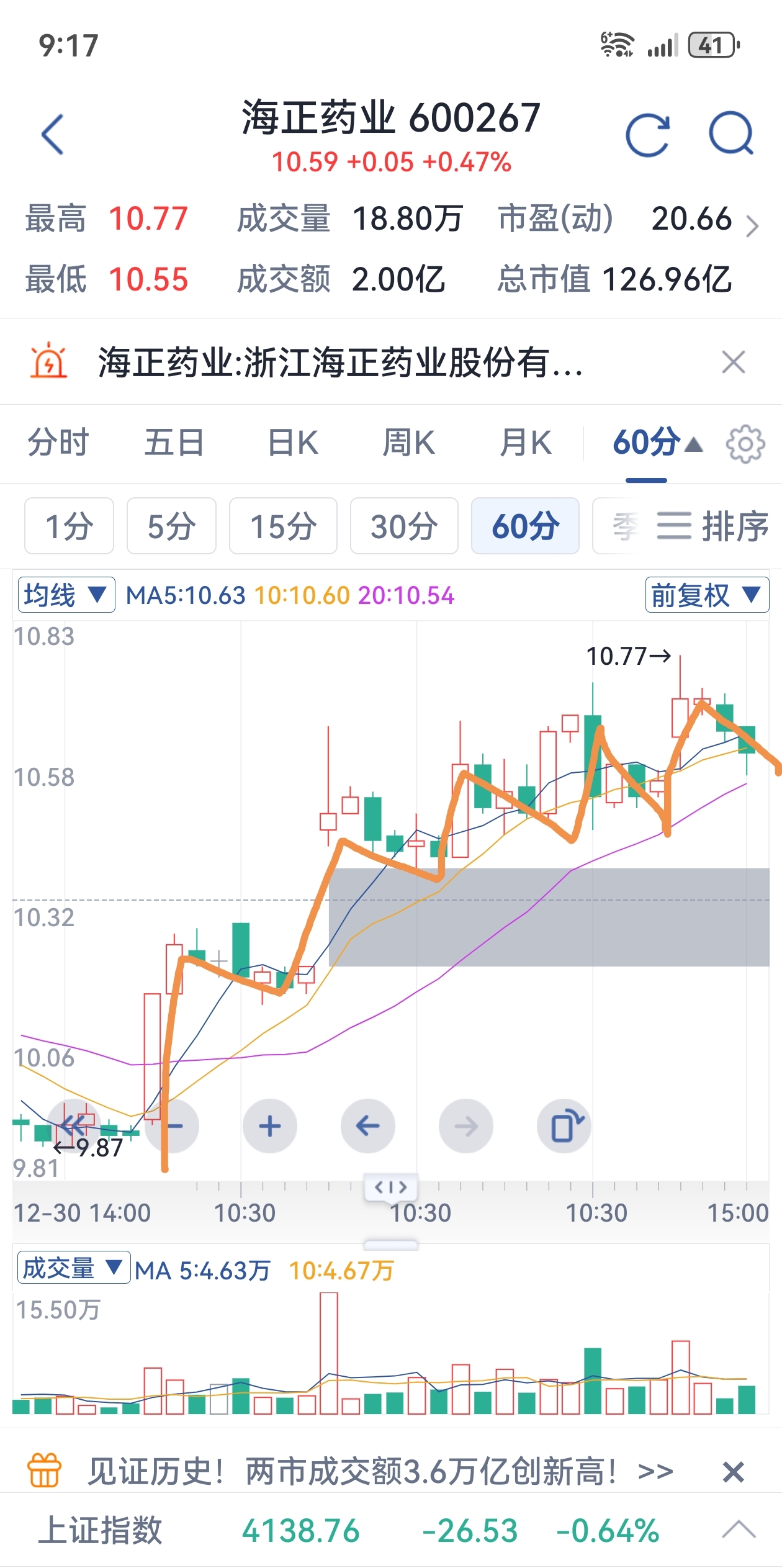 $海正药业(SH600267)$ 从60分钟分时图看,海正活跃度在增加。