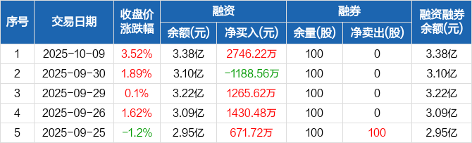 融资方面,当日融资买入7238.07万元,融资偿还4491.84万元,融资净买入2746.22万元。融券方面,融券卖出0股,融券偿还0股,融券余量100股,融券余额1059元。融资融券余额合计3.38亿元。