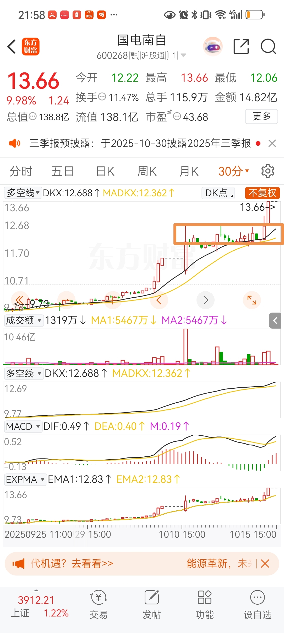 $国电南自(SH600268)$  个票最适合解释平台突破了,我说的这个平台突破是一种广义上的,并非单纯指5日线上的平台突破!而是小级别里的平台突破!比如我用30分钟级别就能一目了然看出来!