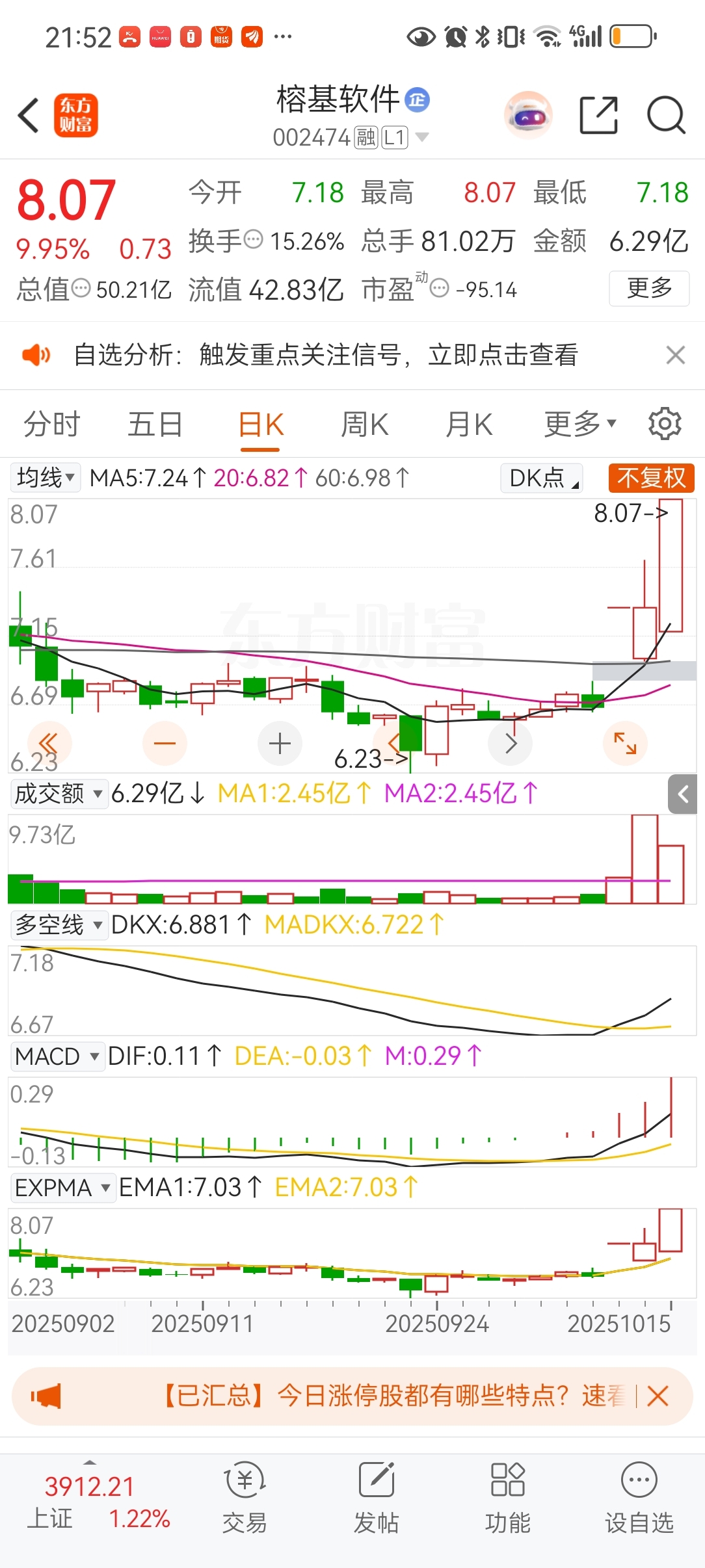 $榕基软件(SZ002474)$  软件开发国产替代逻辑,形态看最近几天资金关注度很高,一字板首板启动,之后放量调整一天,今天缩量快速封板!量能配合很好!3天2板,而另外一个久其软件首板明天也会有板块强度协同作用的,如果两个都能连板,那说明这个板块方向会有较好的持续性!