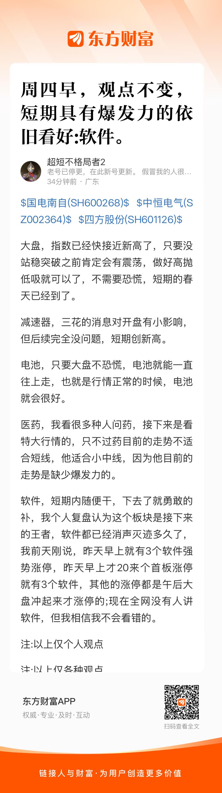 软件,短期内随便干,下去了就勇敢的补,我个人复盘认为这个板块是接下来的王者,软件都已经消声灭迹多久了,我前天刚说,昨天早上就有3个软件强势涨停,昨天早上才20来个首板涨停就有3个软件,其他的涨停都是午后大盘冲起来才涨停的;现在全网没有人讲软件,但我相信我不会看错的。