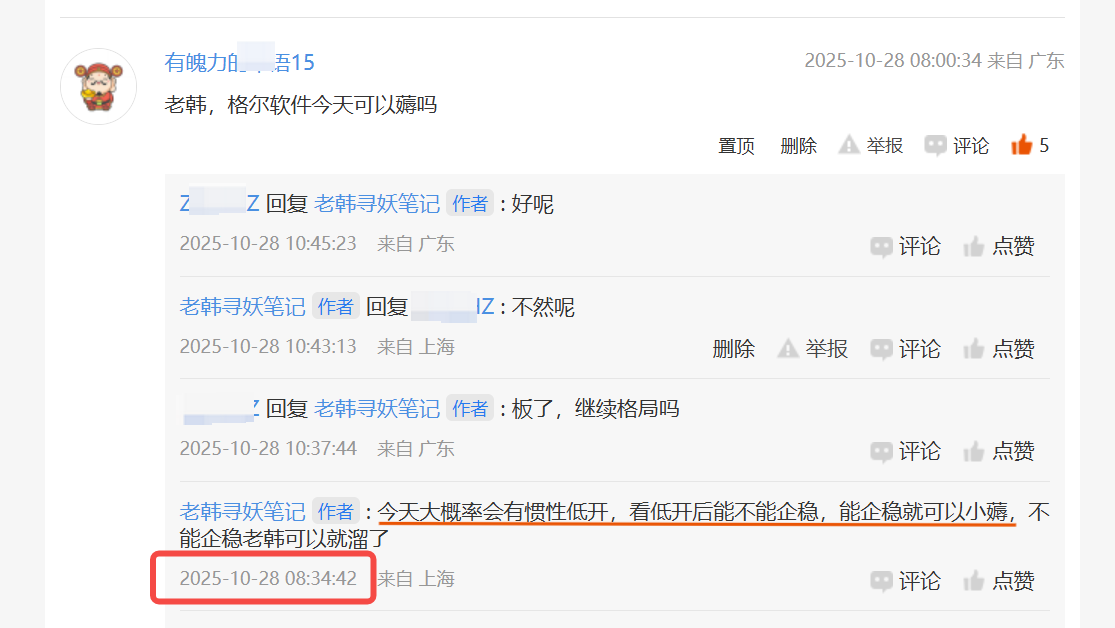 今天如果行情要继续向上,必须要去缩量。昨天炸板尾盘仍然有承接最后收了大阳线,开始说了要向上就一定会缩量今天,如果是大跌肯定会继续爆量,加上现在都市场短线情绪高昂,主力不可能去抬完轿子砸自己的脚,所以大概率会平开去快速拉升或者先洗在拉,但凡你是早点小关老韩,跟着老韩留言区操作一起薅,现在都是20个点的利润一点不慌,随他怎么洗,这种精准的短线行情把握能力,新粉不如先小关点上,多多留意一下。