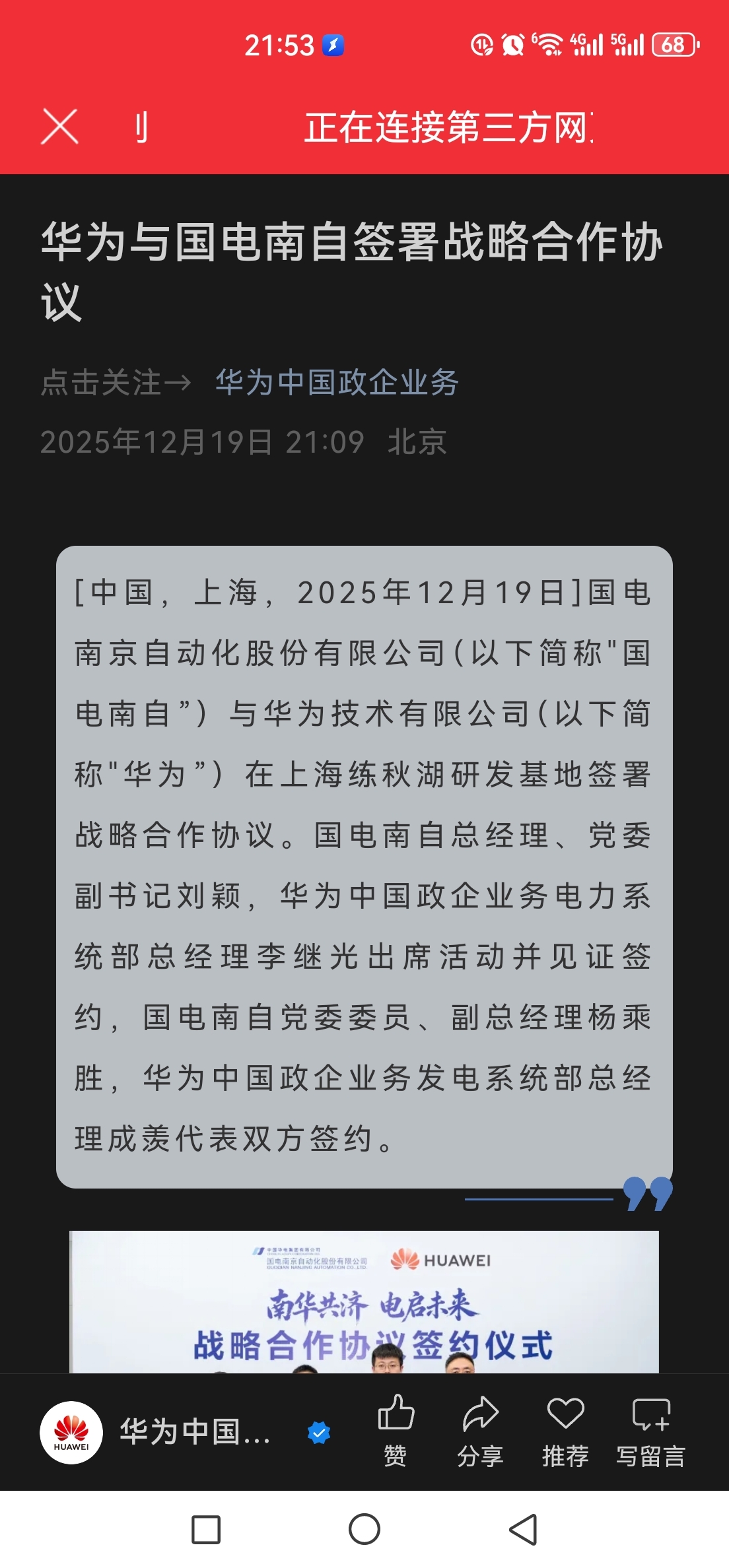 $国电南自(SH600268)$ 国电南自和华为签署战略合作协议!