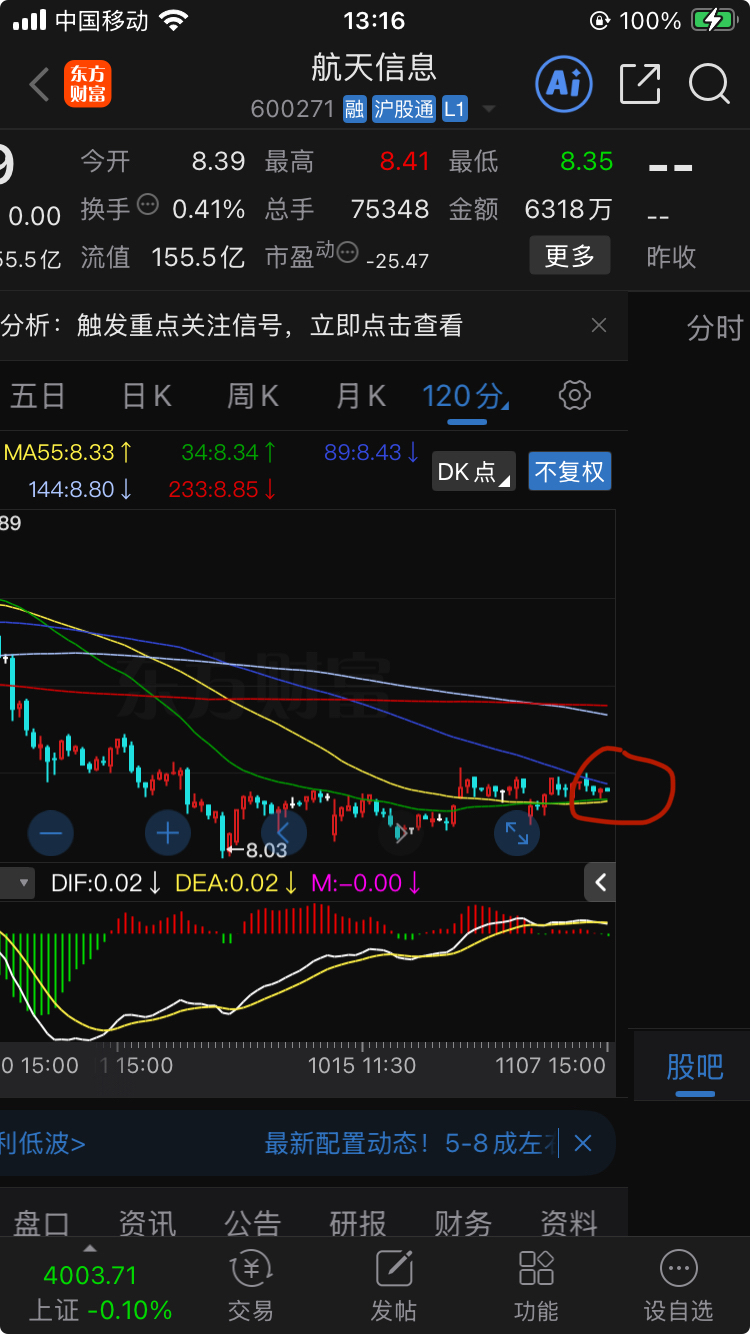 120分钟级别进入粘连横置的黄、绿短期均线组合均线于下压的蓝色均线构成的夹角区域