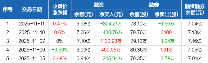 航天信息:融资净偿还804.21万元,融资余额6.98亿元(11-11)