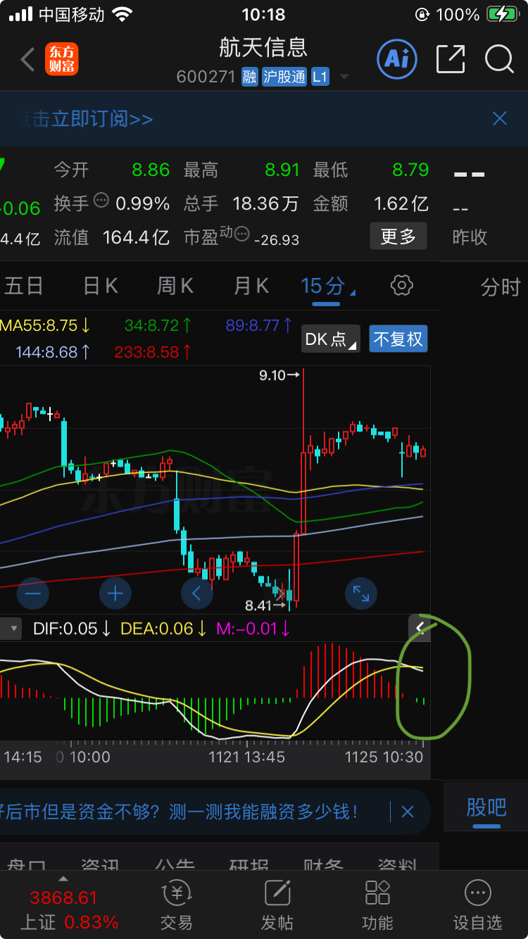 $航天信息(SH600271)$ 15分钟级别涨跌节点——该级别昨天早盘拉起到现在横向震荡一个交易日了,下方出两根绿柱,即将选择方向
