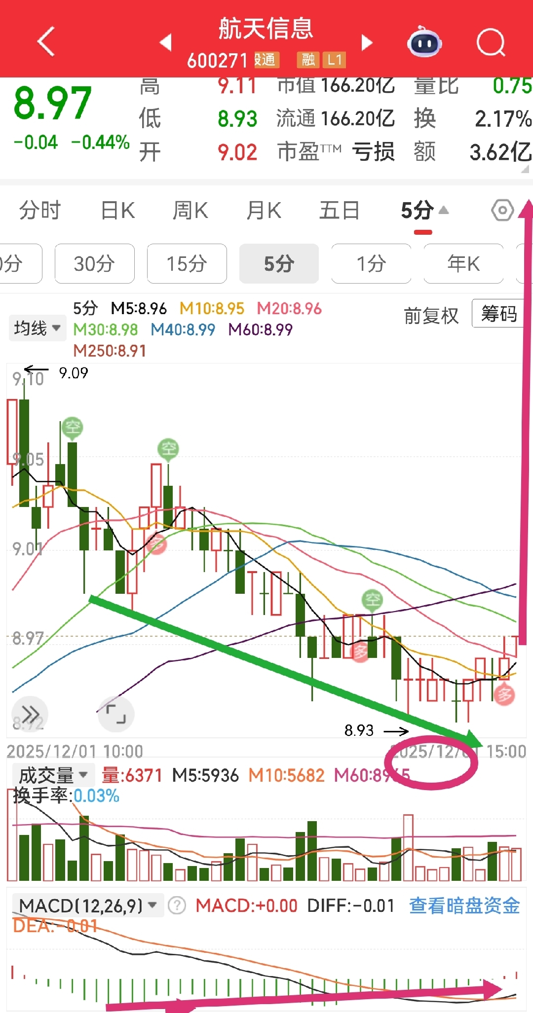 $航天信息(SH600271)$ 股价运行在智能撑压线之间,冲击压力位9.05元遇阻回落,回抽到20日均价线附近获得支撑反弹,今天的冲高回落,引发了5分钟k线图,股价和macd出现下跌背离,后市对应会有5分钟级别的反弹