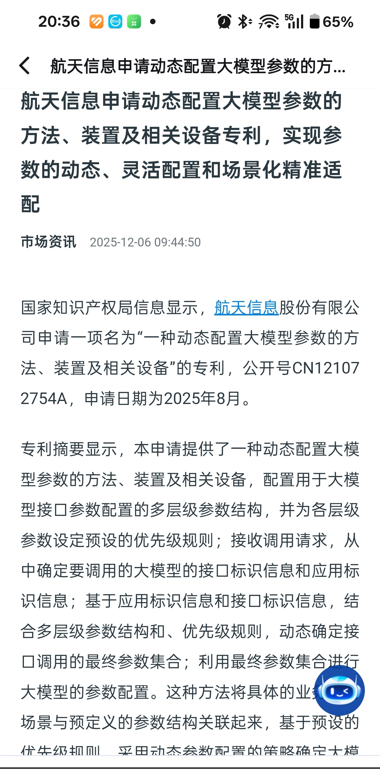 $航天信息(SH600271)$ $航天发展(SZ000547)$ 航天信息申请动态配置大模型参数的方法、装置及相关设备专利,实现参数的动态、灵活配置和场景化精准适配