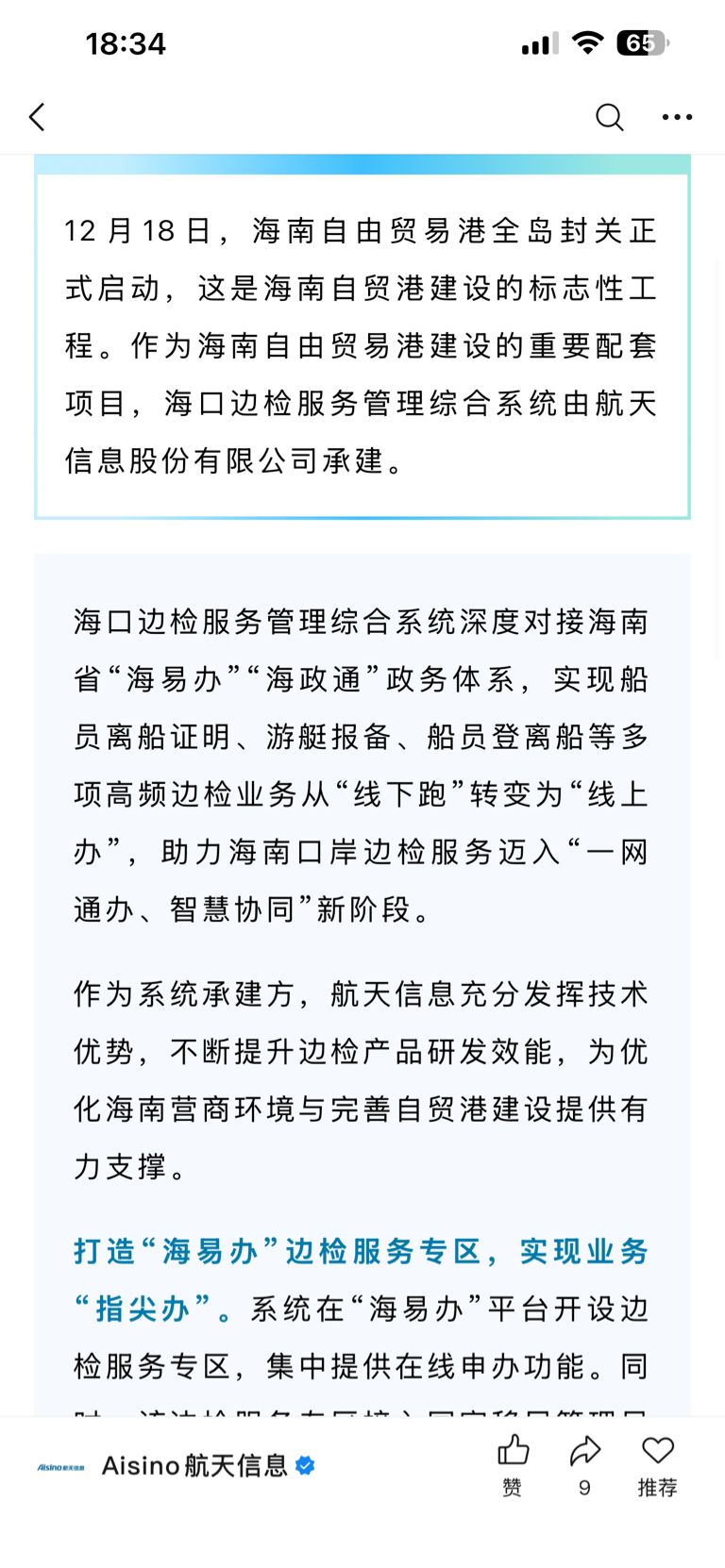 $航天信息(SH600271)$ 香港,澳门,海南都由航信提供,台湾身份证也航信来,明年会有个俄罗斯互通,虽然赚不了太多钱,但是也不少,而且以后这些都是稳的,再加上乐企,市占率50%以上,今年目前250家左右,明年铁定能发展到1000家以上甚至更多