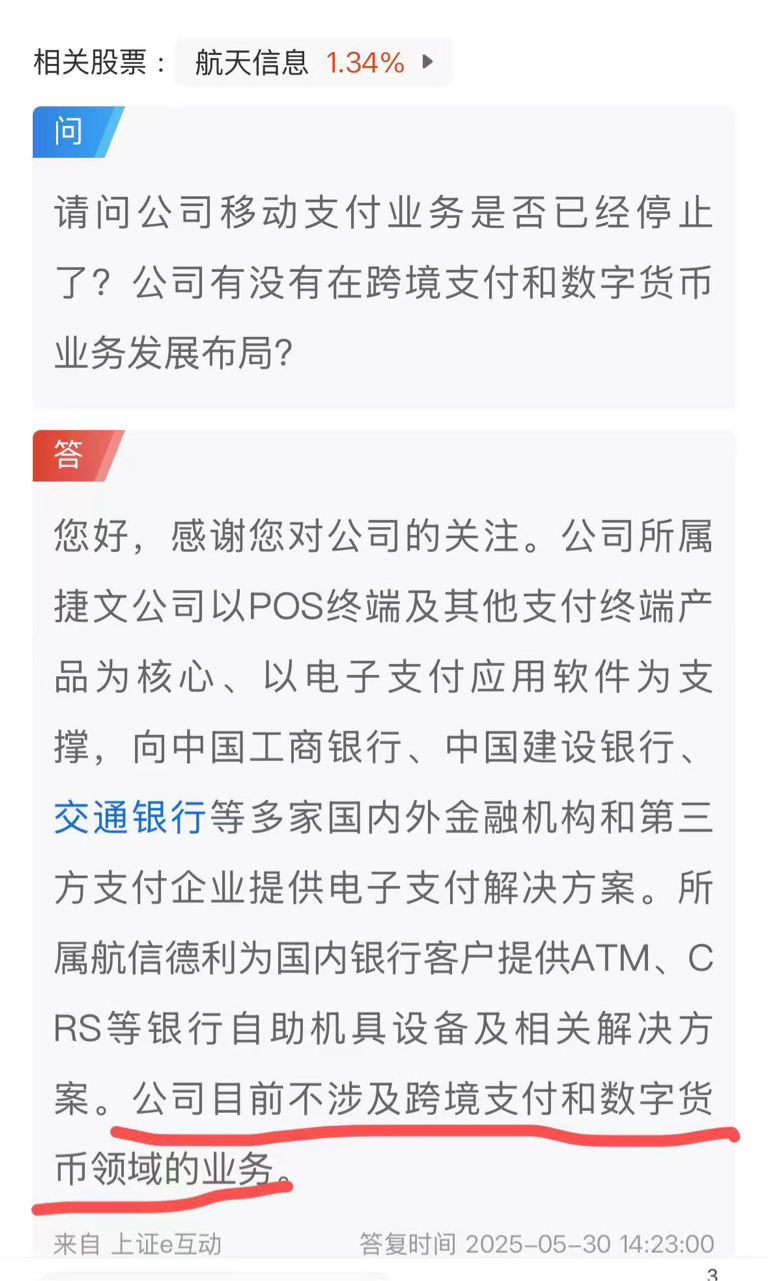 董秘回复,公司目前不涉及商业航天、跨境和数字货币业务,一买套一个别上头哦