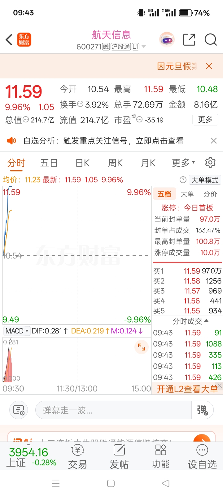 $航天信息(SH600271)$ 恭喜早上上车的伙伴,目前已经封板,拿好等待吃肉,开心跨年!!