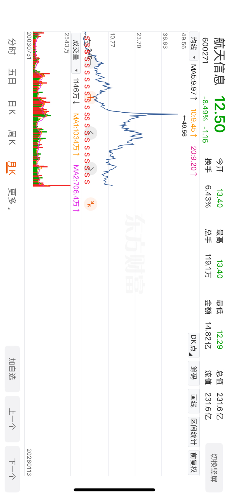 航天信息的月线图。这个航天股为什么就是不涨?