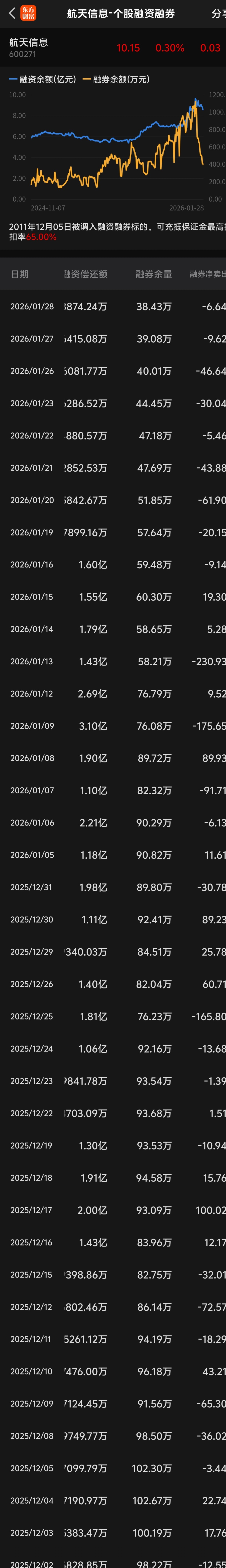 $航天信息(SH600271)$ 昨天的融券余额不应该这么少啊?怎么只剩38.43万股?差不多回到9月3日的35.12万股水平了?12月4日可是高达102.67万股啊!这里很多短线高手昨天不是信信旦旦说要跌到八、九块钱吗?怎么不拼老命去融券做空呢?