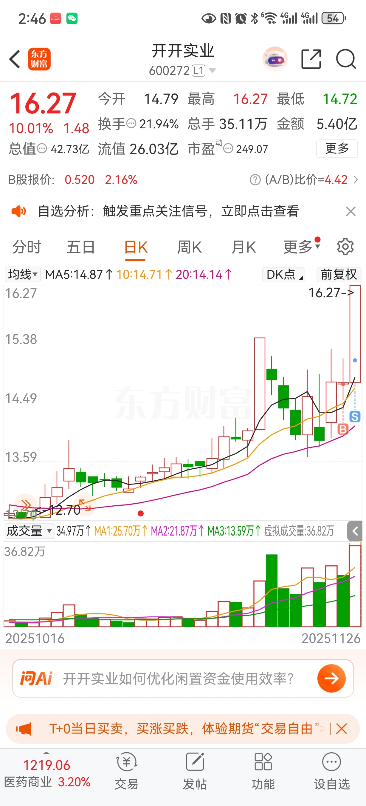 $开开实业(SH600272)$ 大家感谢我吧,我不卖是不会涨停的