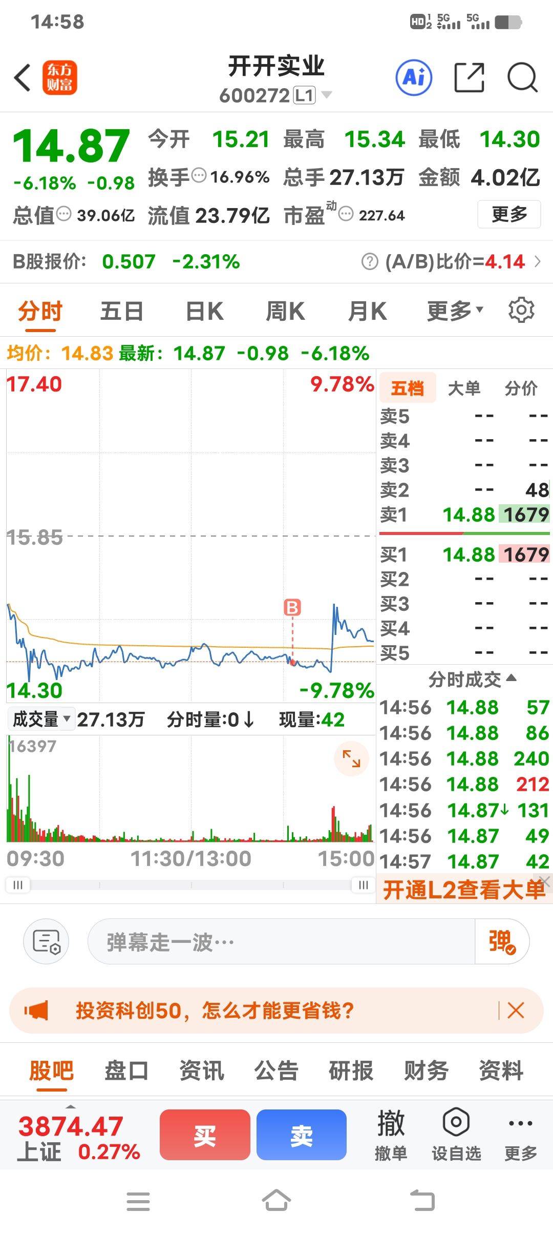 $开开实业(SH600272)$ 哥最讨厌尾盘几分钟竞价跑的人,一点格局都没有活着,活着就是浪费空气。