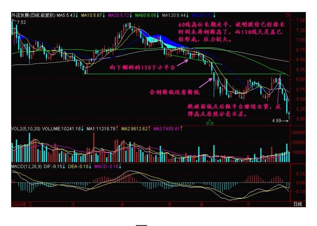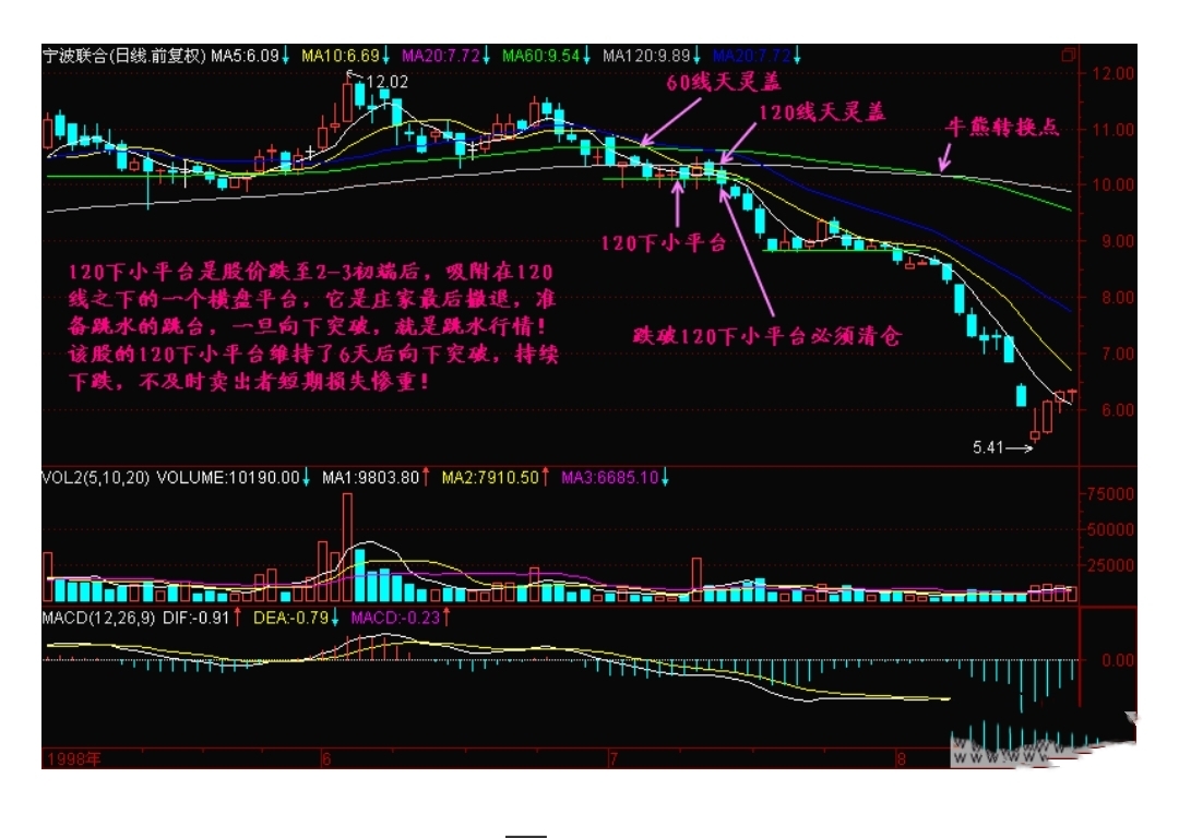 120下小平台是指股价跌至2-3初端之后,位于120日平均线下的一个横向盘整平台,横向时间大约两、三周,这里是庄家抓紧出货准备撤退的最后区间,也可以将这个平台理解成高台跳水的跳台。