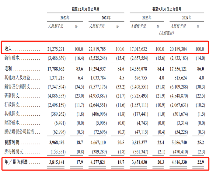 通过不断加码研发,恒瑞医药已经取得了令人欣喜的战绩。招股书显示,创新药销售收入占比由2022年的38.1%增至2023年的43.4%,并进一步增至截至2024年9月30日止九个月的47.7%。根据弗若斯特沙利文研究报告,在中国制药企业中,恒瑞2023年新分子实体创新药收入及在研创新药数量均名列前茅。
