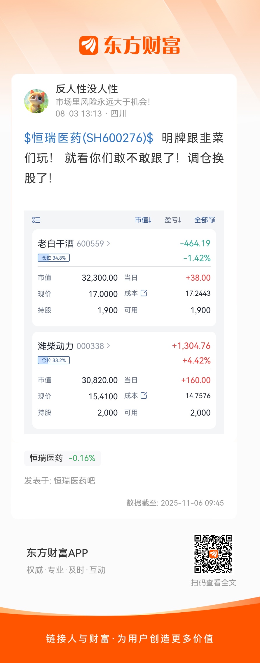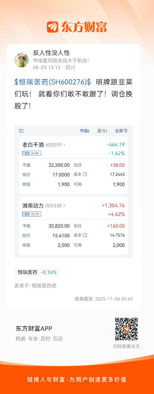$恒瑞医药(SH600276)$  明牌跟韭菜们玩! 就看你们敢不敢跟了!调仓换股了!