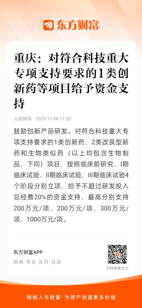 重庆市人民政府办公厅印发《重庆市全链条支持创新药高质量发展若干措施》,其中提出,鼓励创新产品研发。对符合科技重大专项支持要求的1类创新药、2类改良型新药和生物类似药(以上均包含生物制品,下同)项目,按照临床前研究、Ⅰ期临床试验、Ⅱ期临床试验、Ⅲ期临床试验4个阶段分别立项,给予不超过研发投入总经费20%的资金支持,最高分别支持200万元/项、200万元/项、300万元/项、1000万元/项。
