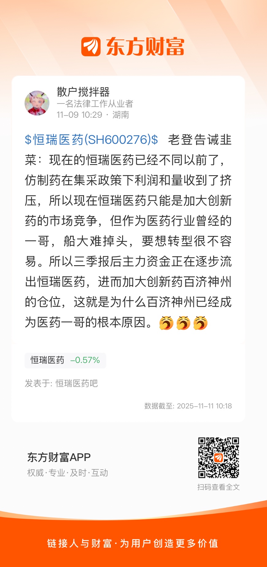 $恒瑞医药(SH600276)$ 老登告诫韭菜:现在的恒瑞医药已经不同以前了,仿制药在集采政策下利润和量收到了挤压,所以现在恒瑞医药只能是加大创新药的市场竞争,但作为医药行业曾经的一哥,船大难掉头,要想转型很不容易。所以三季报后主力资金正在逐步流出恒瑞医药,进而加大创新药百济神州的仓位,这就是为什么百济神州已经成为医药一哥的根本原因。