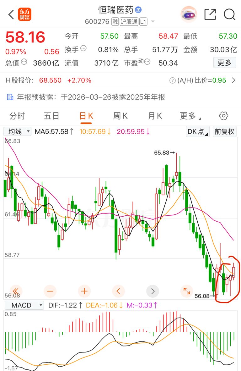 $恒瑞医药(SH600276)$ 在这个大阴线抄得底,以为要黄了,今天看到了一点点希望。