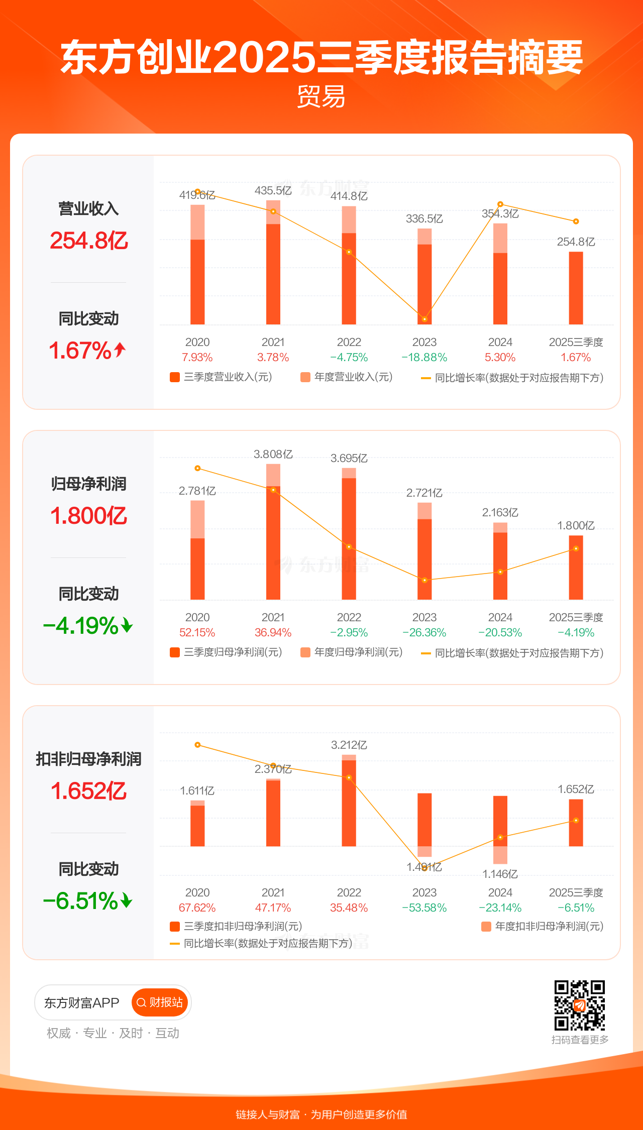 东方创业10月31日发布2025年三季报显示,公司前三季实现营业收入254.83亿元,同比增长1.67%;归母净利润1.80亿元,同比下滑4.19%;扣非归母净利润1.65亿元,同比下滑6.51%。