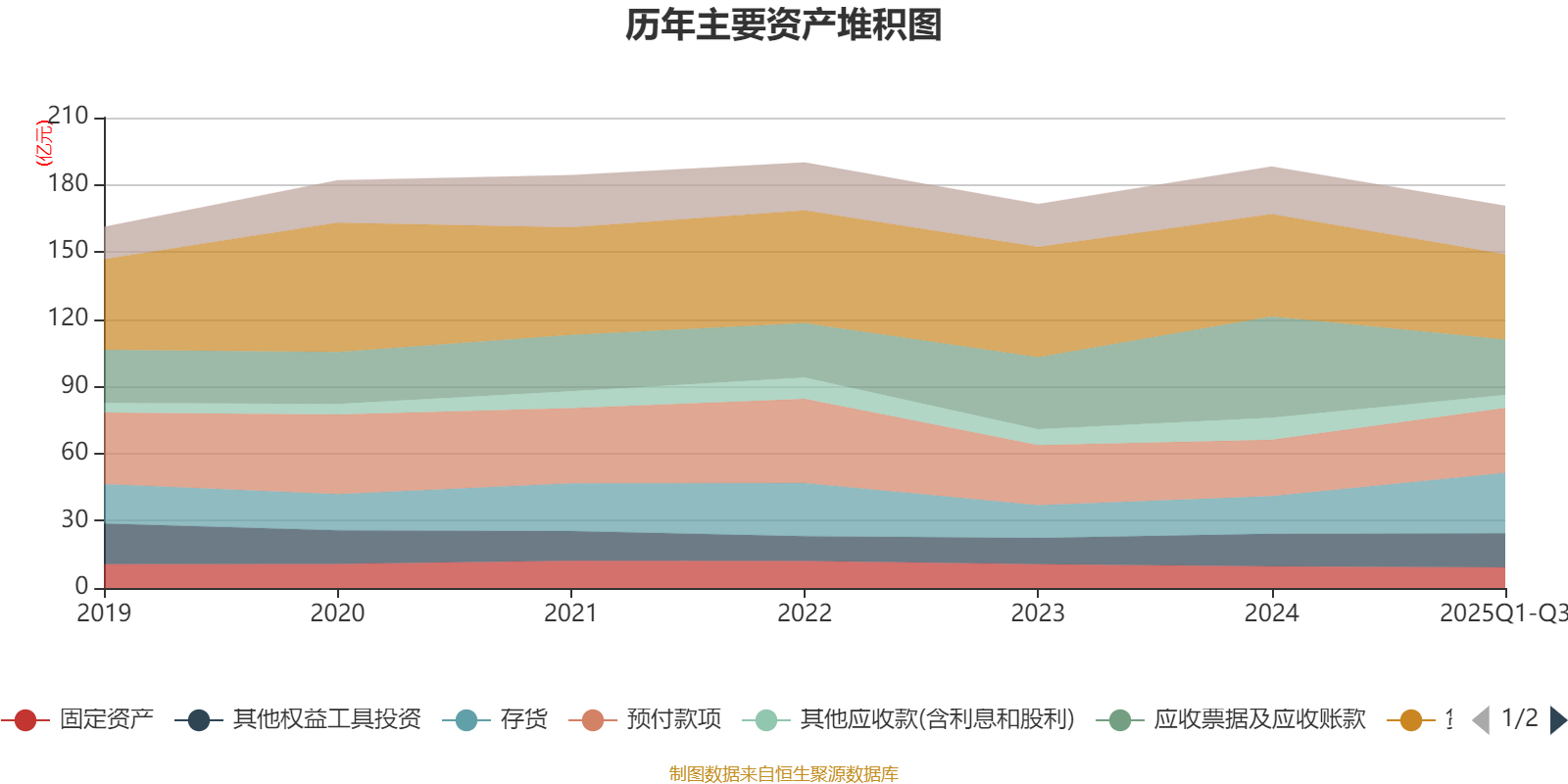 资产重大变化方面,截至2025年三季度末,公司应收票据及应收账款较上年末减少45.17%,占公司总资产比重下降9.48个百分点;存货较上年末增加60.88%,占公司总资产比重上升6.92个百分点;预付款项较上年末增加15.07%,占公司总资产比重上升3.6个百分点;货币资金较上年末减少16.87%,占公司总资产比重下降2.02个百分点。