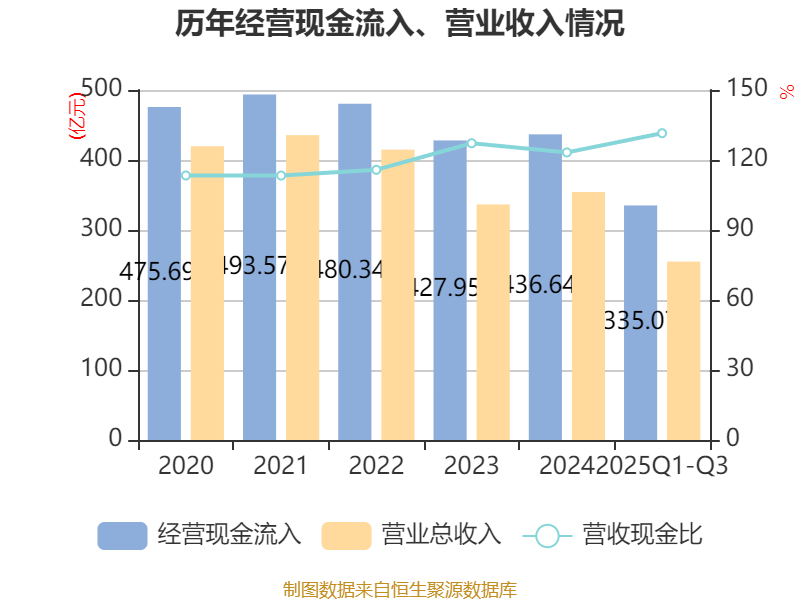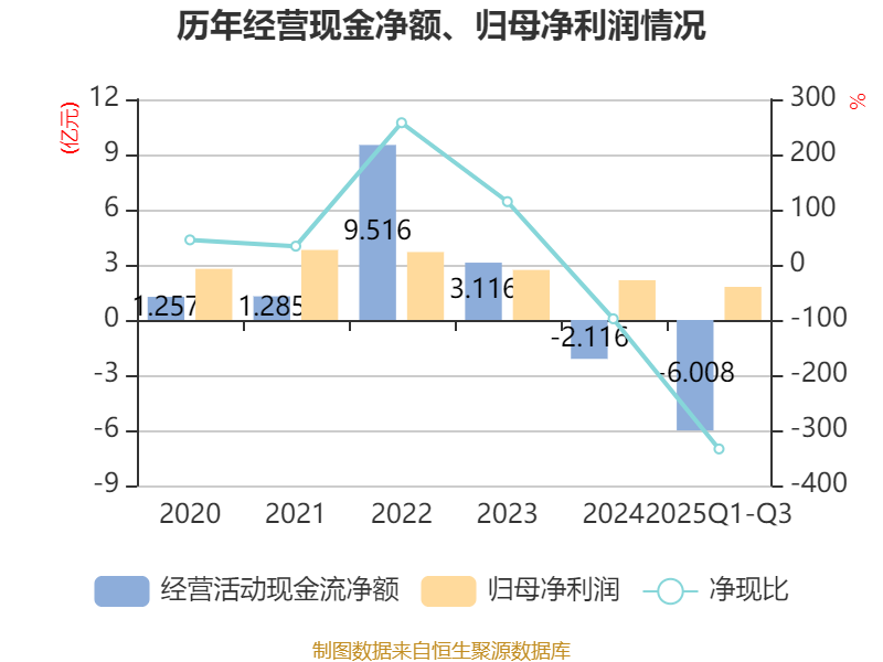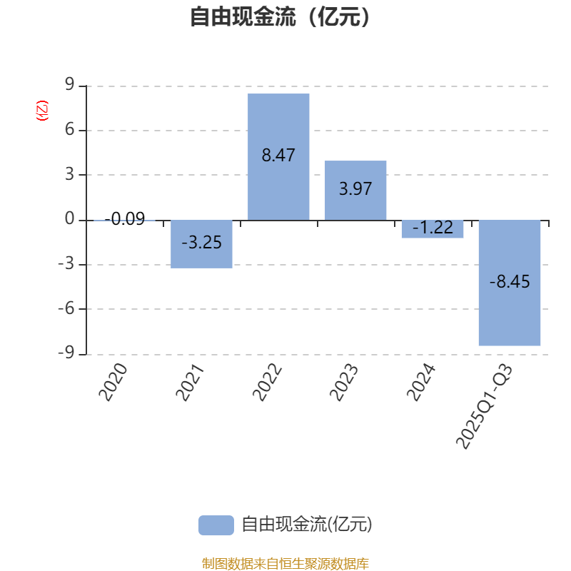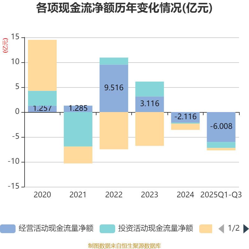 2025年前三季度,公司经营活动现金流净额为-6.01亿元,同比增加2016.2万元;筹资活动现金流净额-4712.23万元,同比减少3.16亿元;投资活动现金流净额-1.21亿元,上年同期为-9315.59万元。