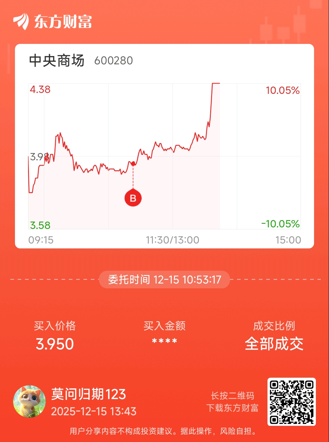 $中央商场(SH600280)$ 今天2个涨停拿到,10几个点,这就是高手