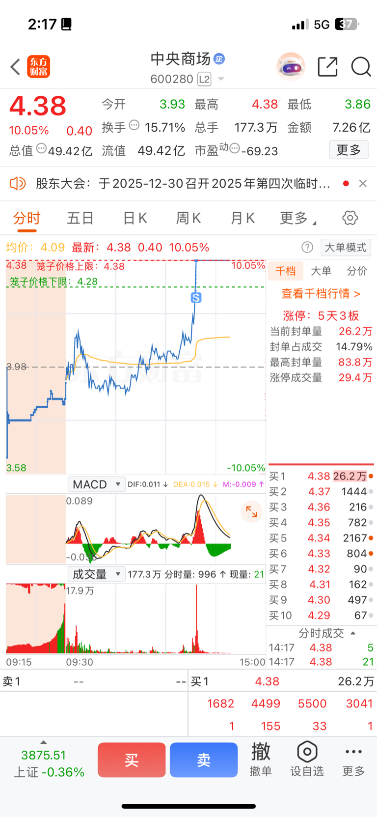 $中央商场(SH600280)$ 老夫掐指一算,根本封不住,只赚了5个点跑路