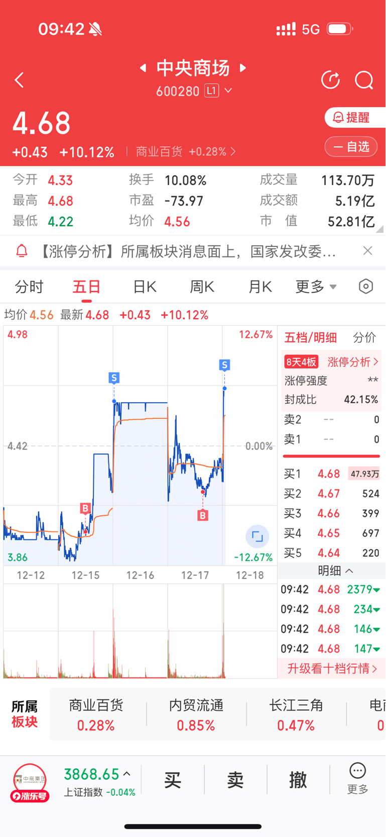 $中央商场(SH600280)$ 感觉这波卖飞了……
