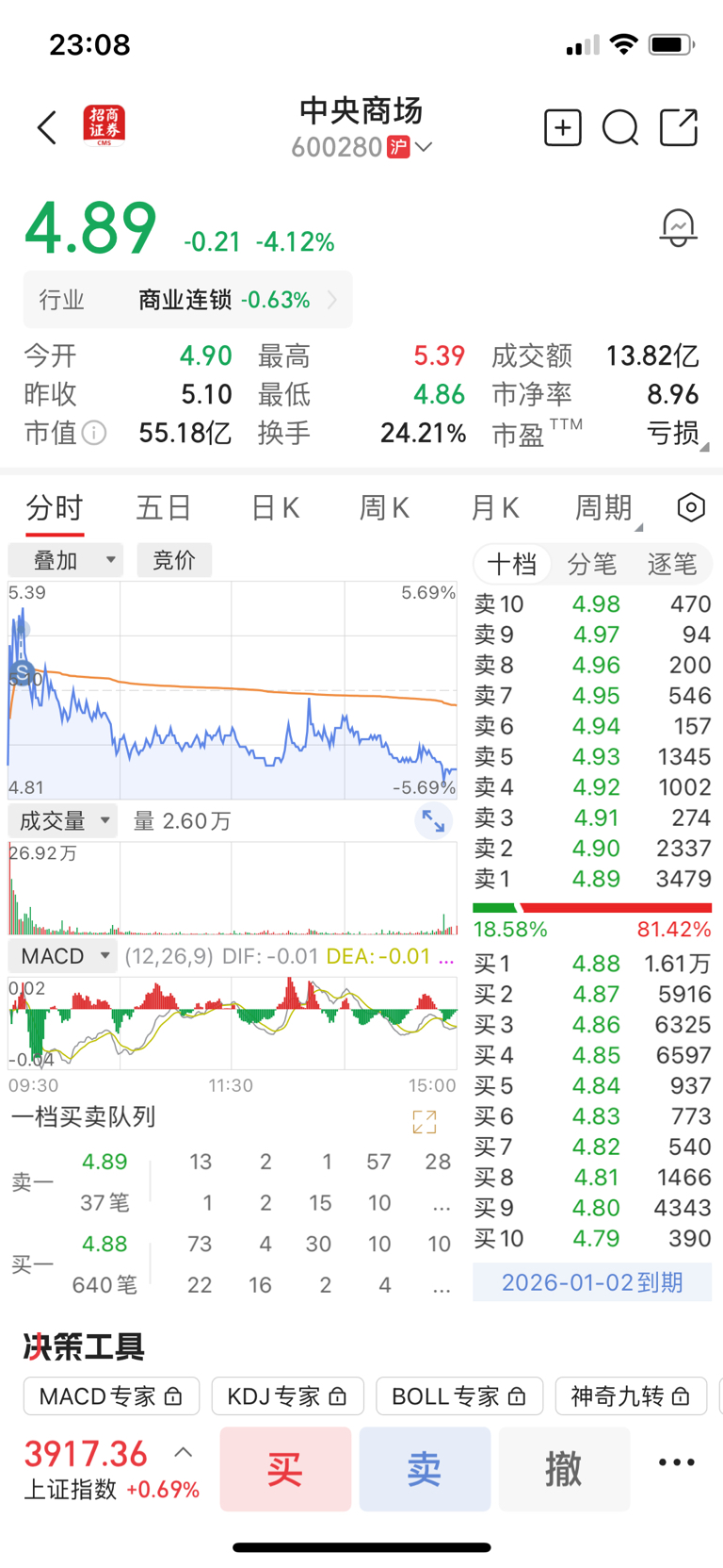 $中央商场(SH600280)$ 真是垃,还好早盘跑了,