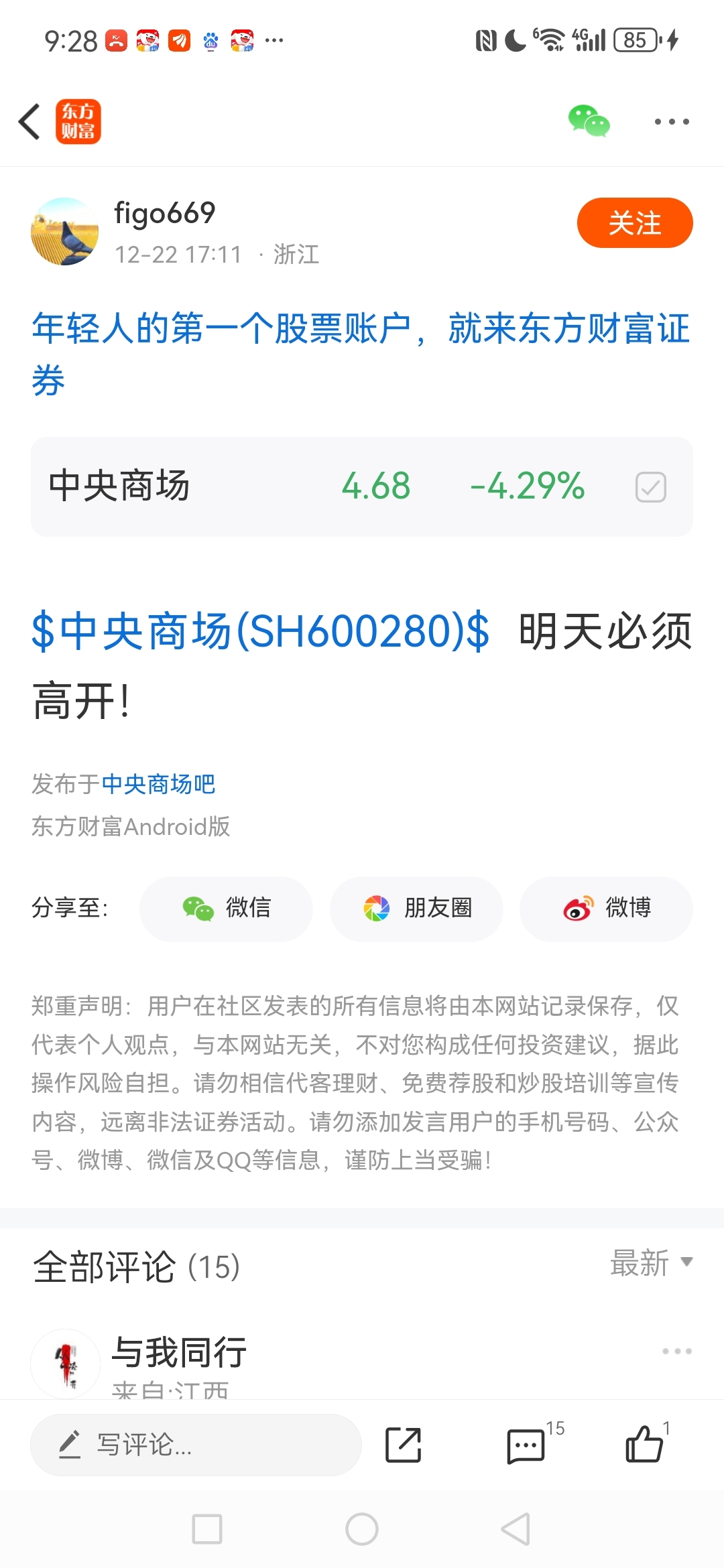 $中央商场(SH600280)$ 我兑现了自己的承诺 东百继续新高 中央继续新低 现在有请吧里三个口嗨患者 第一位前天说昨天高开必涨 啪啪打脸 第二位简介就是口嗨 昨天说中央收盘4.78 会涨得尾灯都看不到 继续打脸 第三位更厉害 删帖王者 按图索骥 都预测今天明天涨停 发图不解释