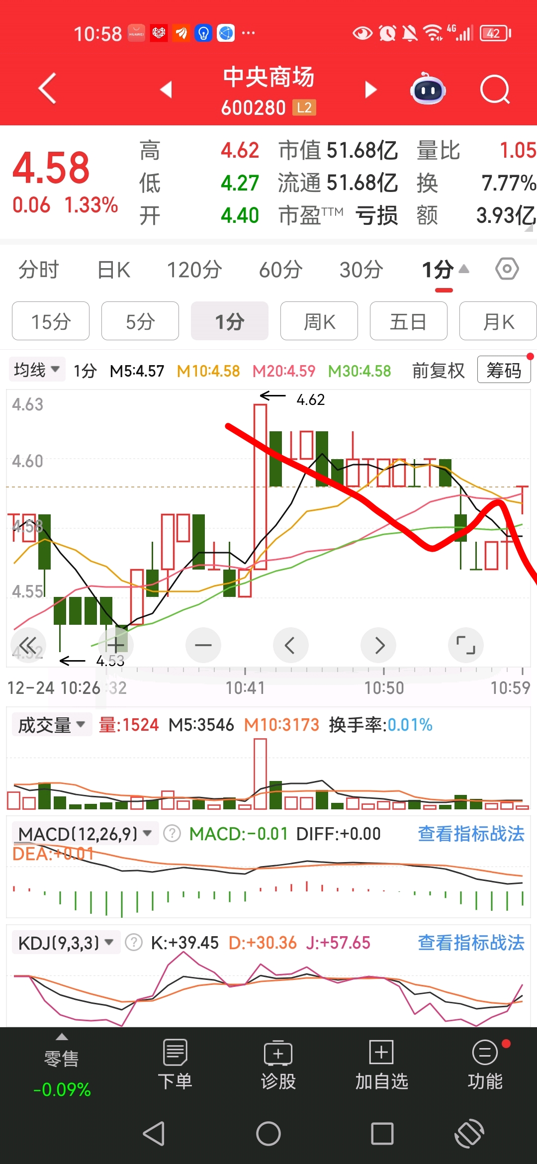 $中央商场(SH600280)$ 1分钟死叉选择向下了,兄弟们来永辉