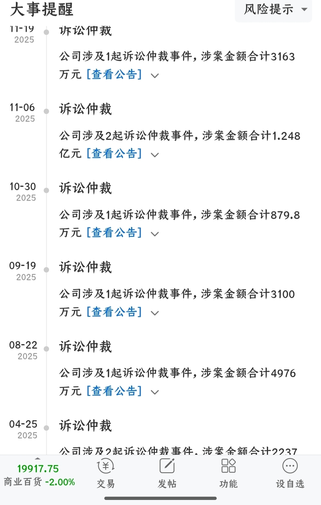 $中央商场(SH600280)$ 还有官司比他多的公司吗