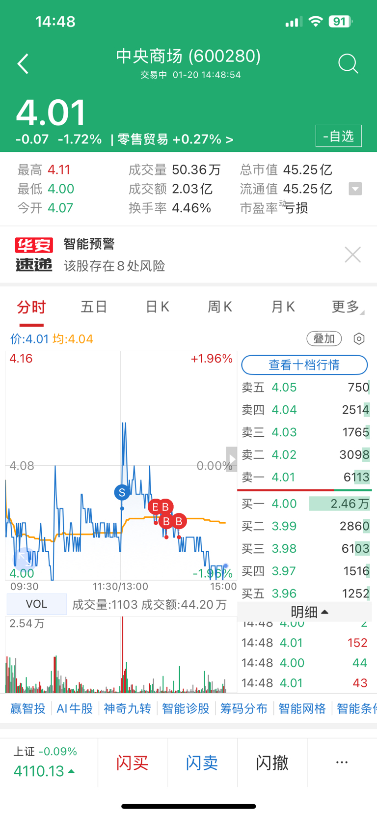 $中央商场(SH600280)$ 做了个T,4.10卖,4.03、4.02接回来