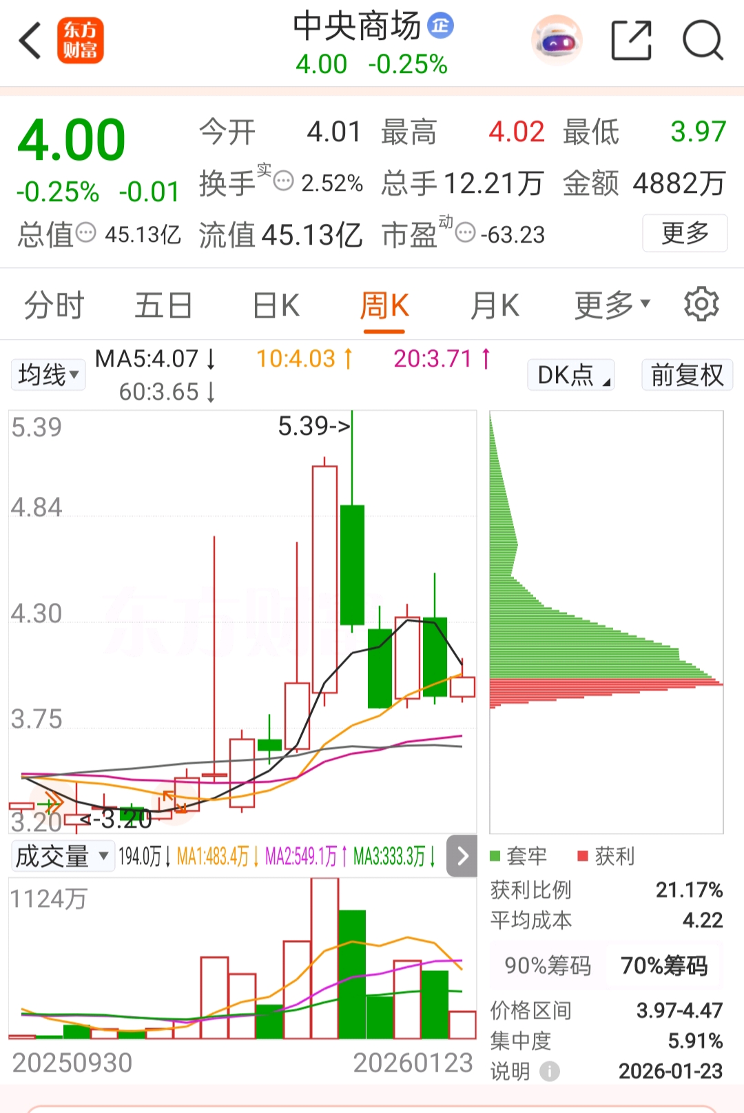 $中央商场(SH600280)$ 看一下这个周线图,应该还要回踩跌到3.5