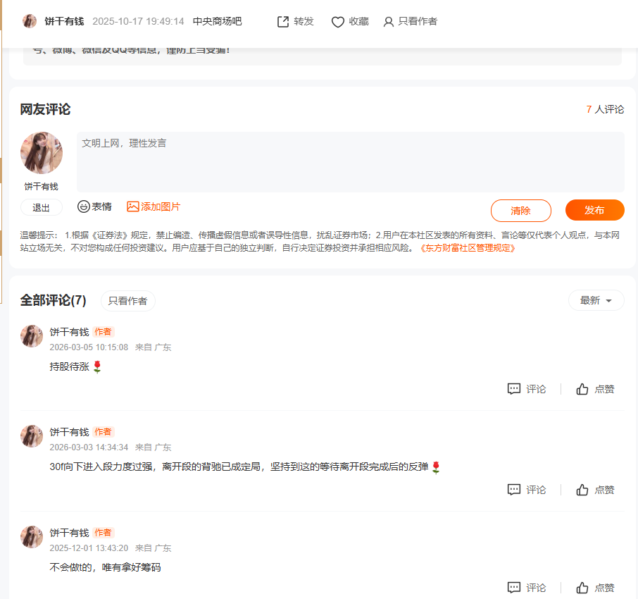 温馨提示: 1.根据《证券法》规定,禁止编造、传播虚假信息或者误导性信息,扰乱证券市场;2.用户在本社区发表的所有资料、言论等仅代表个人观点,与本网站立场无关,不对您构成任何投资建议。用户应基于自己的独立判断,自行决定证券投资并承担相应风险。《东方财富社区管理规定》