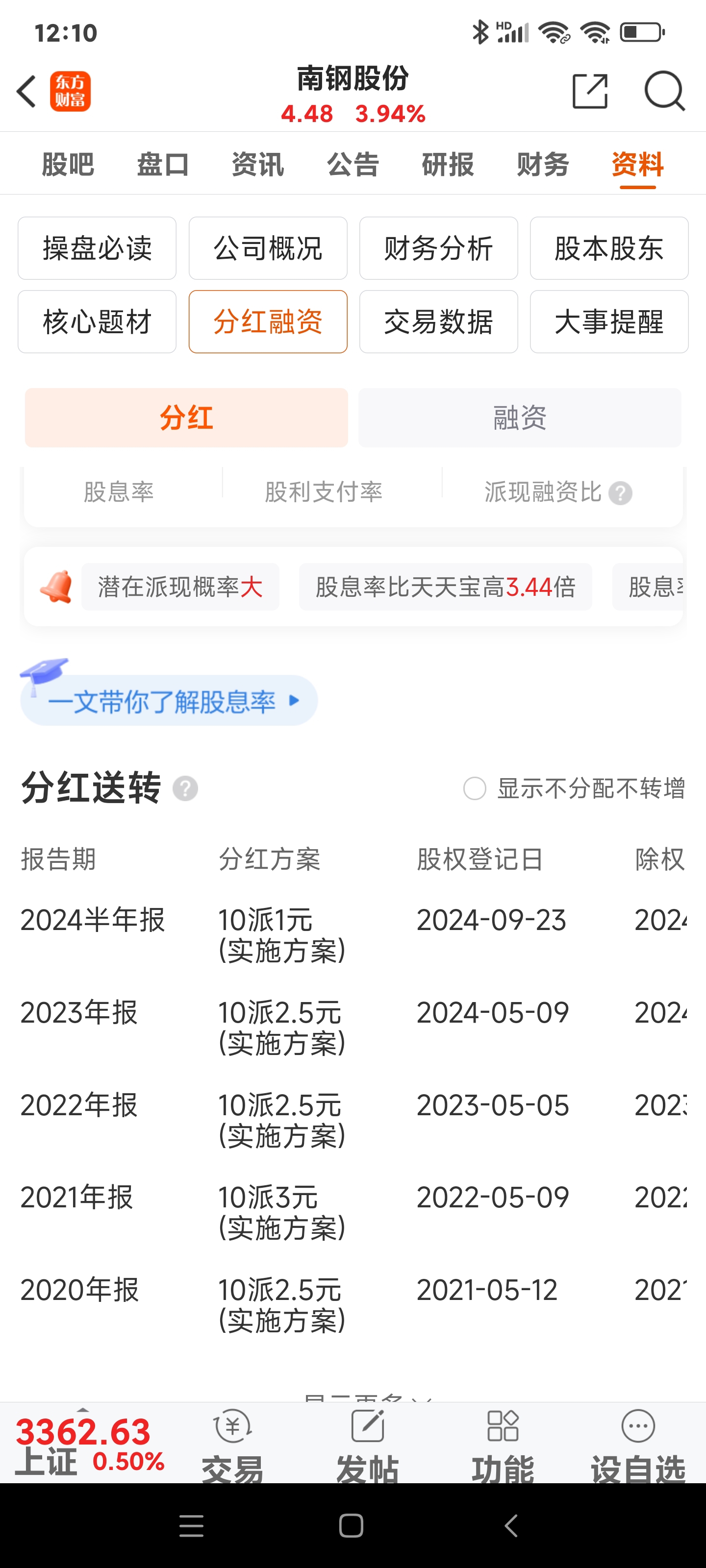 南钢股份2024年两次分红,合计10派3.5元。中午股价4.48最新股息率7.8