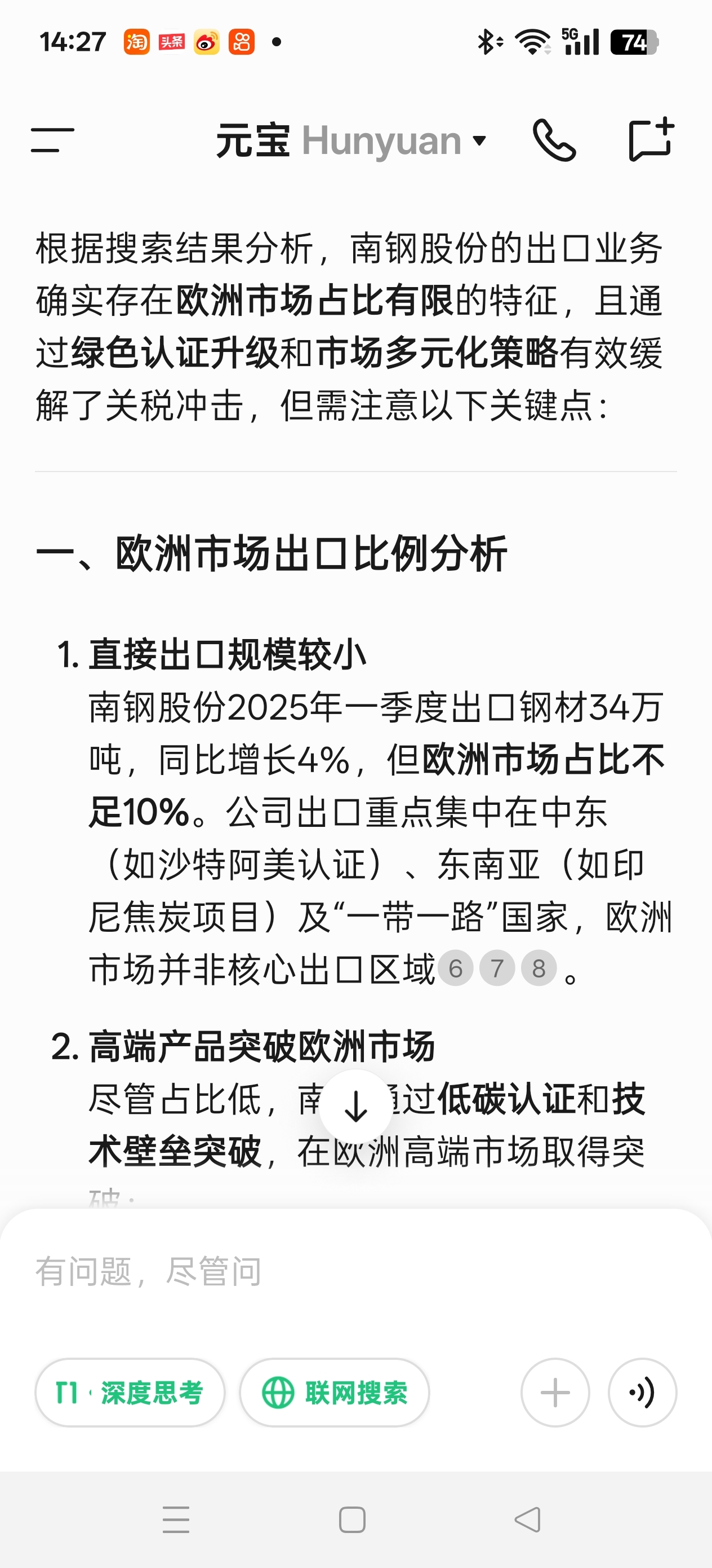 别说欧洲现在是拟征收50%关税,就是真征收对南钢股份影响有限,今年一季度南钢股份